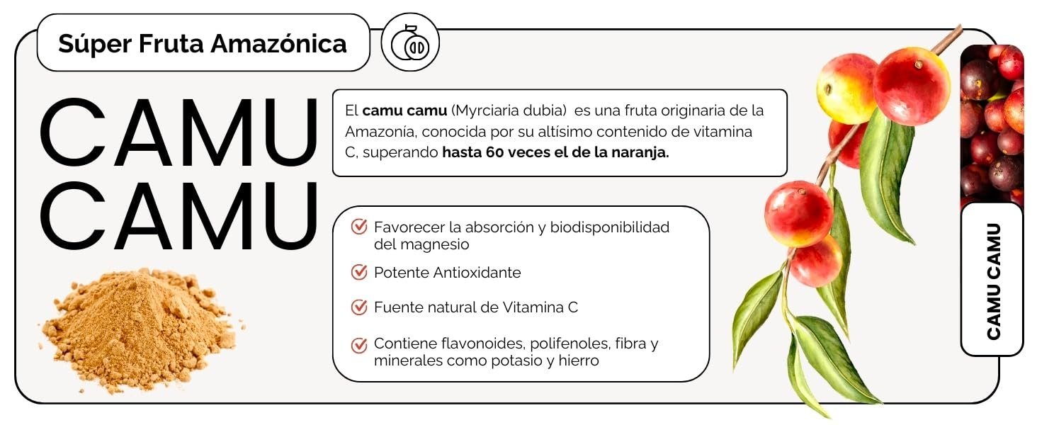Es un complemento muy completo, combina magnesio con los beneficios del camu camu de forma ideal.