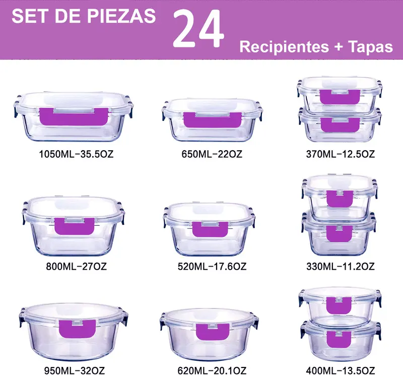 •  Set de 24 piezas:12 recipientes y 12 tapas.Incluye 4 disenos redondos.Tamanos:2x40oml/620ml. Ideal parausodiario en la cocina.